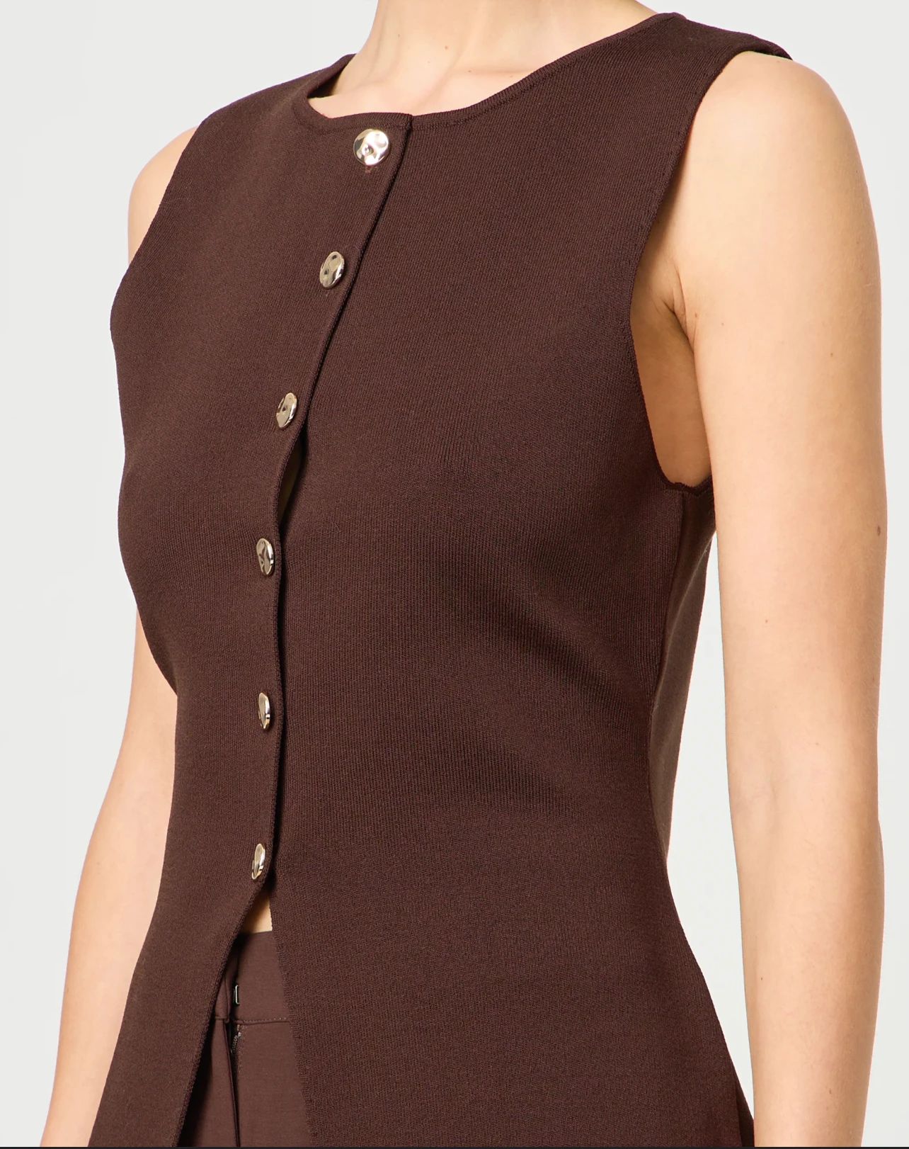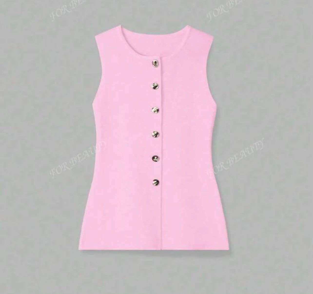 Embrace the perfect combination of elegance and ease with the Sleeveless Button-Up Knit Top, a staple piece that enhances any wardrobe.